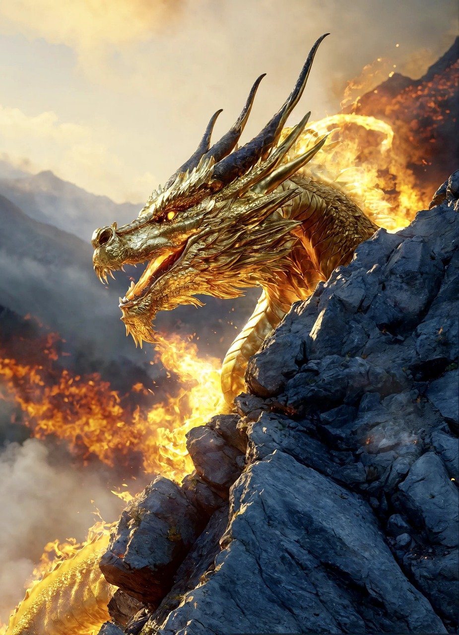 The head of a golden dragon emerging from rocks with golden smoke around him