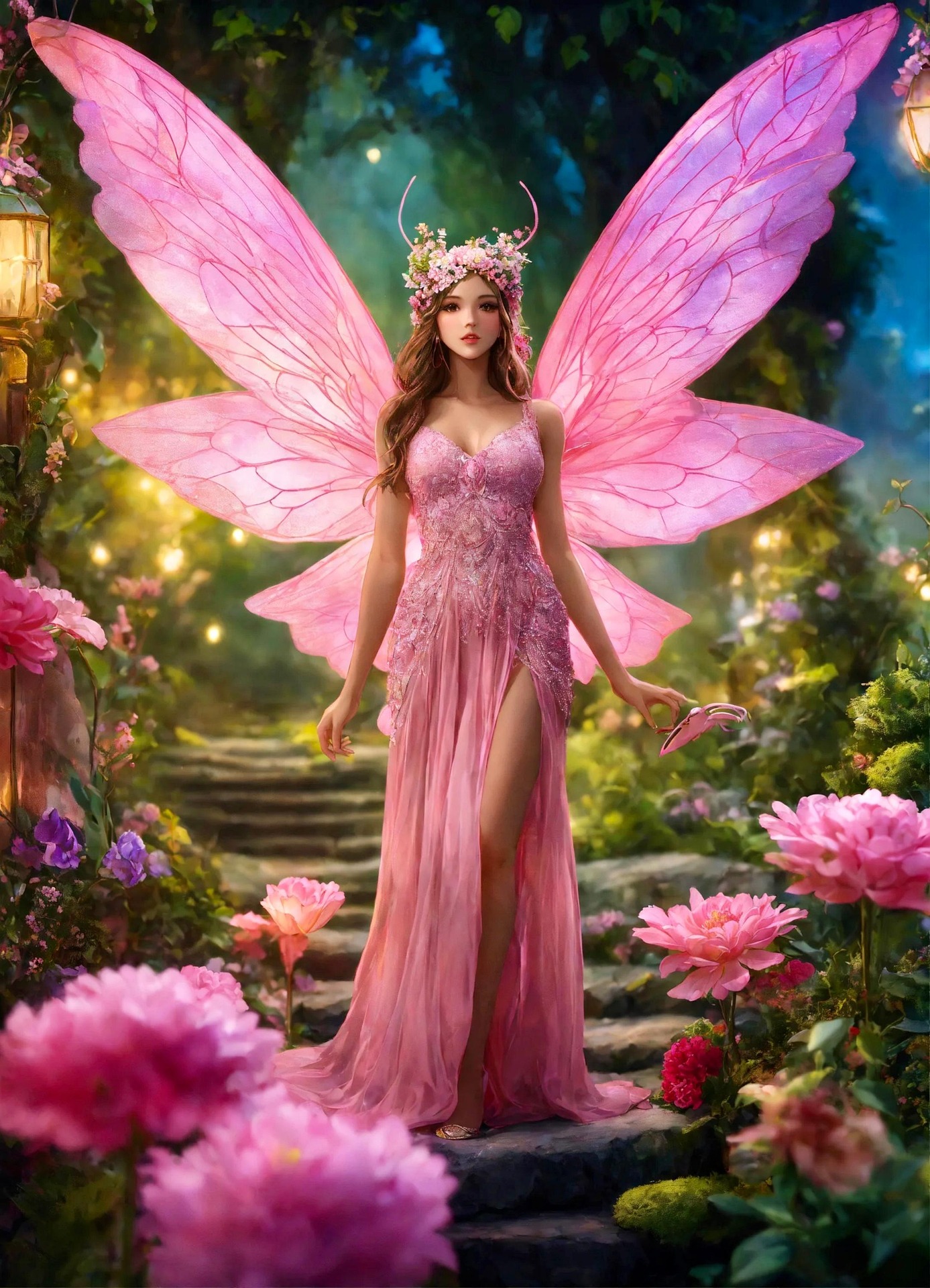 A woman with large pink fairy wings, long brown hair with flowers in it and a short pink dress. She is on a woodland path with pink flowers.